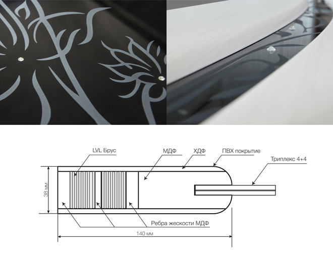 Плавные линии подчеркивают элегантный образ и особую грацию. Используемое стекло триплекс не только повышает безопасность эксплуатации, но и предоставляет богатый выбор вариантов обработки: гравировку, художественные рисунки и стразы в качестве декорирования.